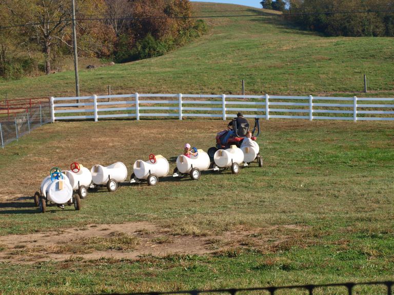 We were already in the Kid’s Farmyard Fun area so we ran over to the tractor train ride, Phoebe was just a little small so just our little kitty went on the train.