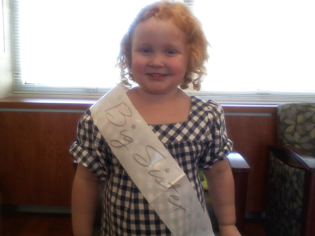 Pyper was so excited to be a big sister, we had lost a child at 12 weeks a year before so when we got pregnant again we weren’t sure we should tell her yet.  It was awfully hard telling her when we miscarried she was only 3 and didn’t quite understand.  She had been talking about it for weeks and even chose the name Meat YES Meat for the baby.  So we tried again we waited until after the 12 week check up to tell her.  She was so happy but asked a lot if the baby was “still in there”.   We made sure that she knew she was just as loved as always and that a new person was going to love her just as much.  We made sure that she was at the hospital and we even got her a Big Sister care package to take with her.  A new Princess bag with new books about siblings and that one book everyone has “I Love You This Much”!   She was most excited about the sash (-: