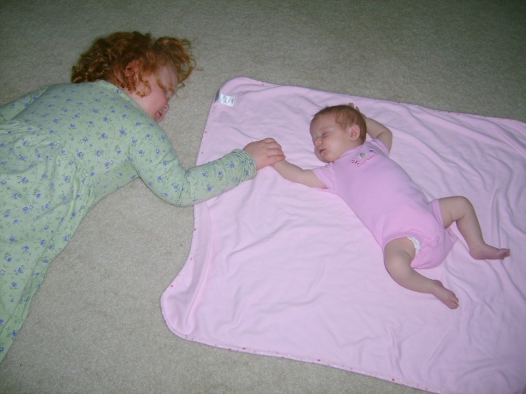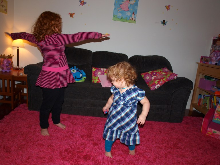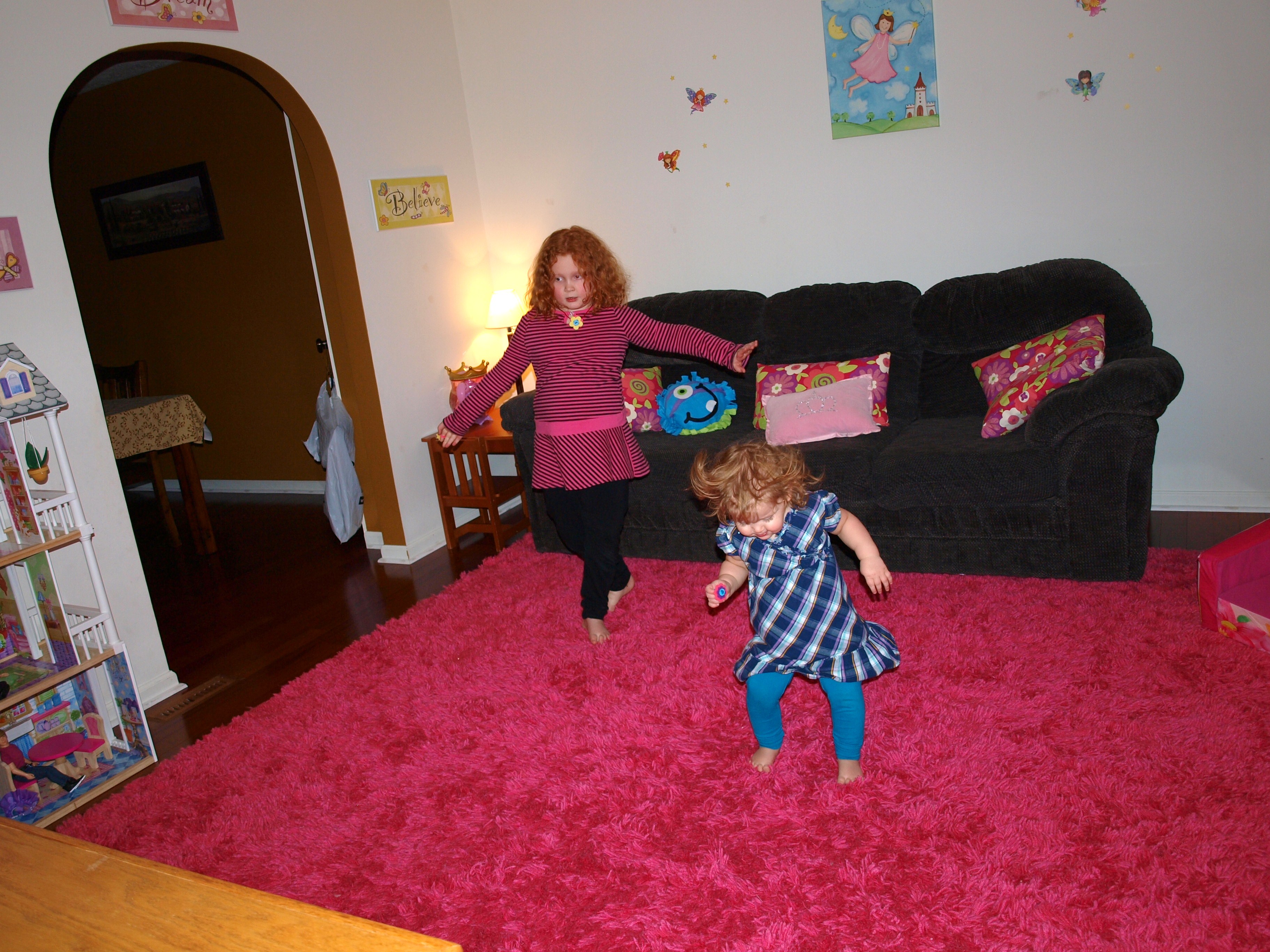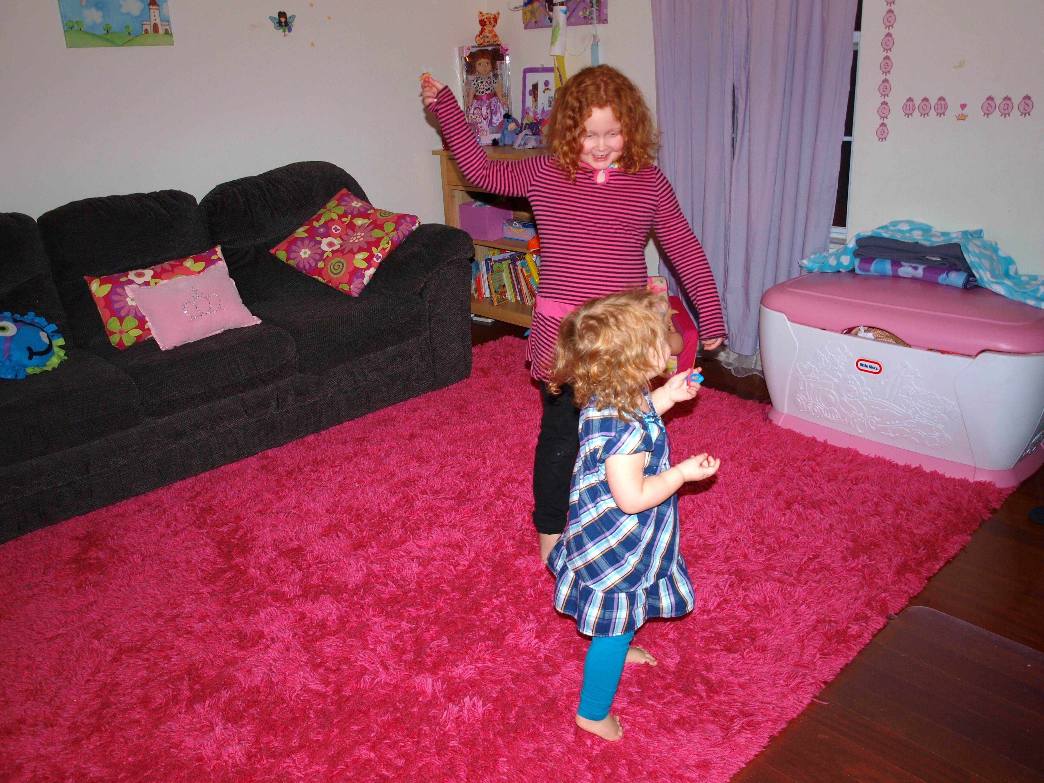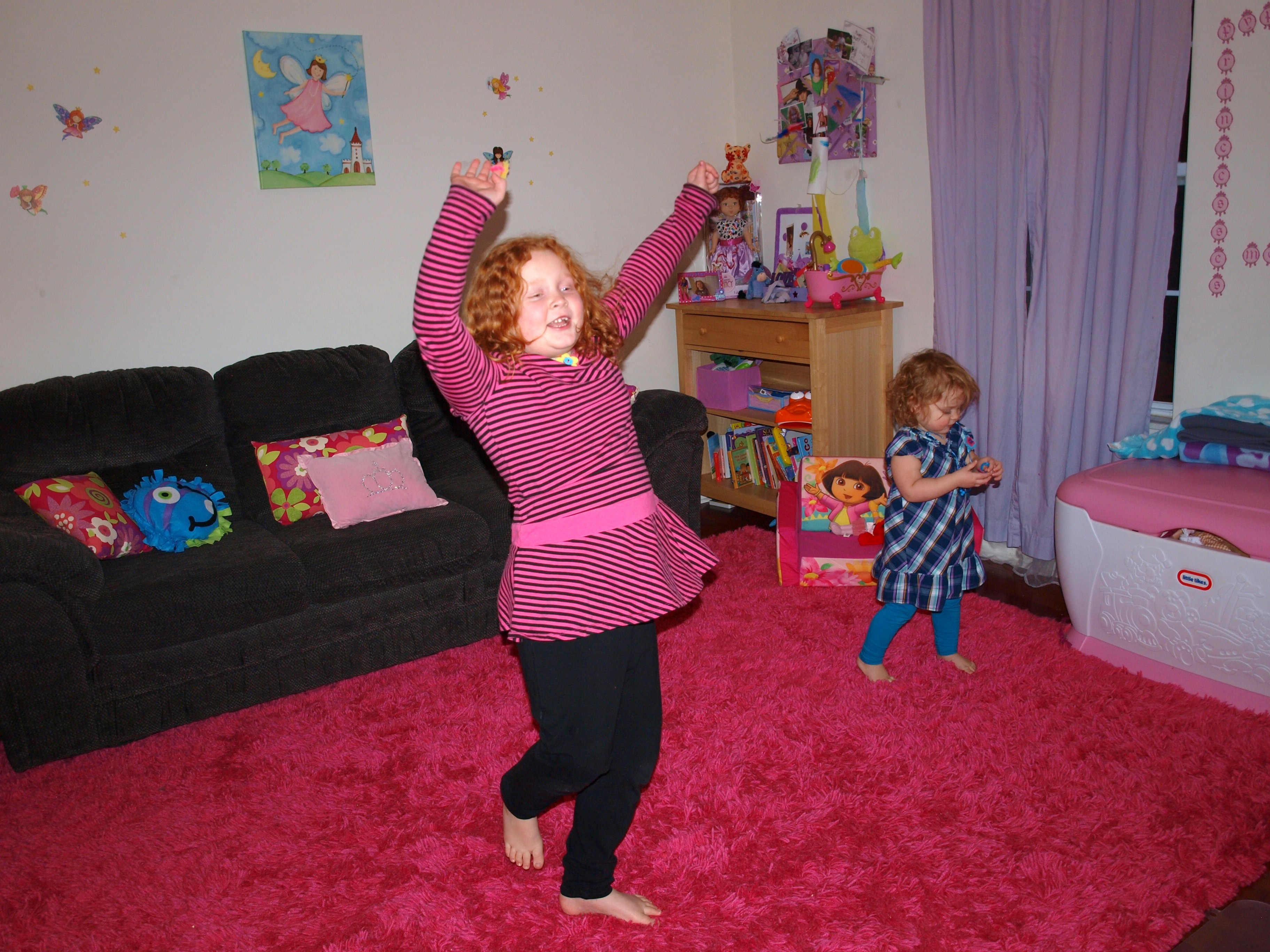 Now look at them!  Dance Parties every night in the playroom!  Phoebe is now 2 and a half and Pyper as she will tell you is 6 and a half!   Now they can play and argue and just be sisters.  No more baby lying around for her to hold but she still hugs her a lot and kissed her head even if she doesn’t want her too LOL!