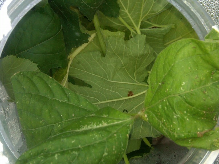 I was out there every day morning and evening looking feverishly for these darn eggs so I wouldn’t get veggie eating bugs!  Every day I found more I didn’t get it I thought I drowned the two bugs that made all these buggers (no pun intended).  After a month of filling jars with egg filled leaves, it just got worse…..