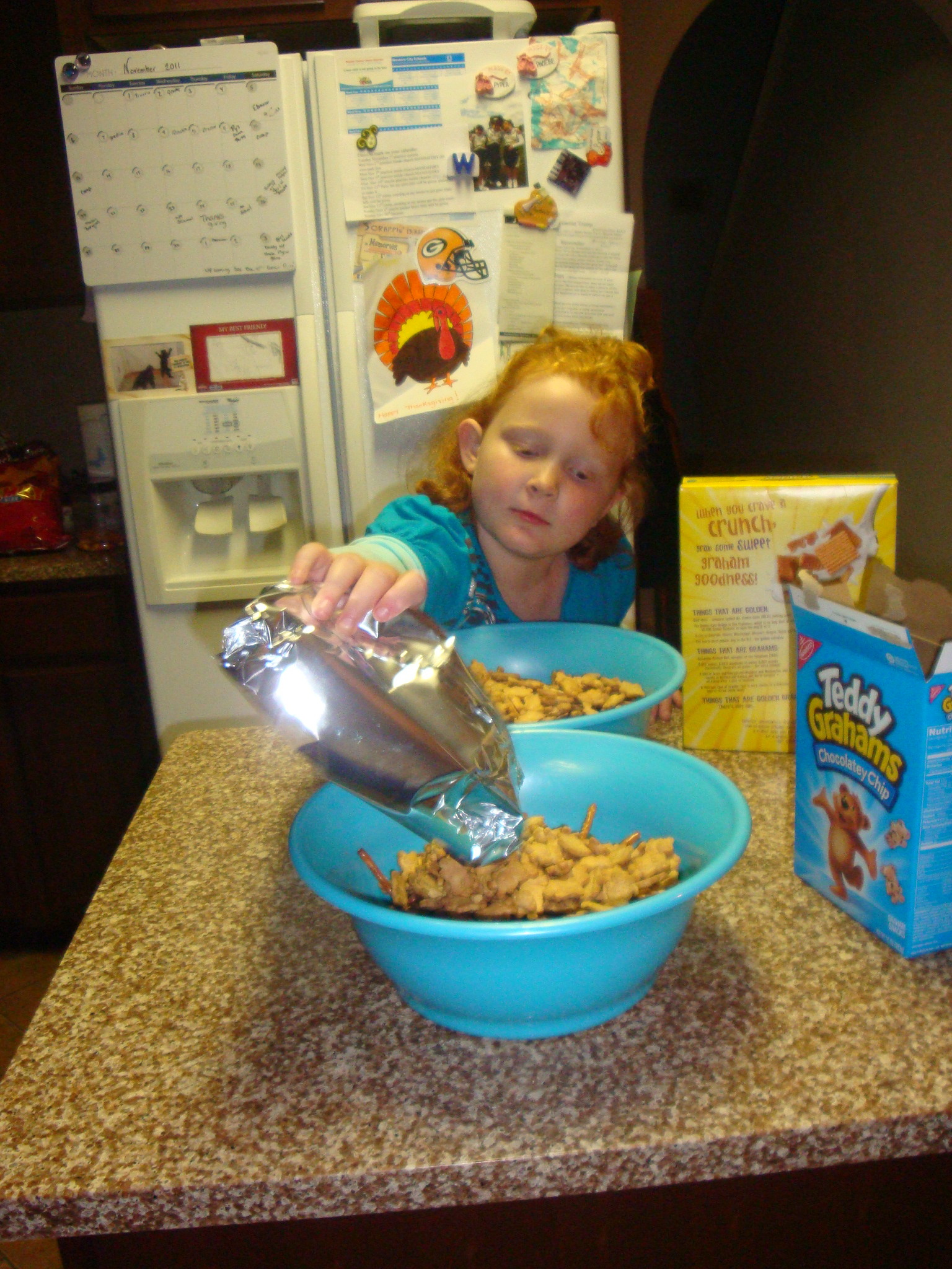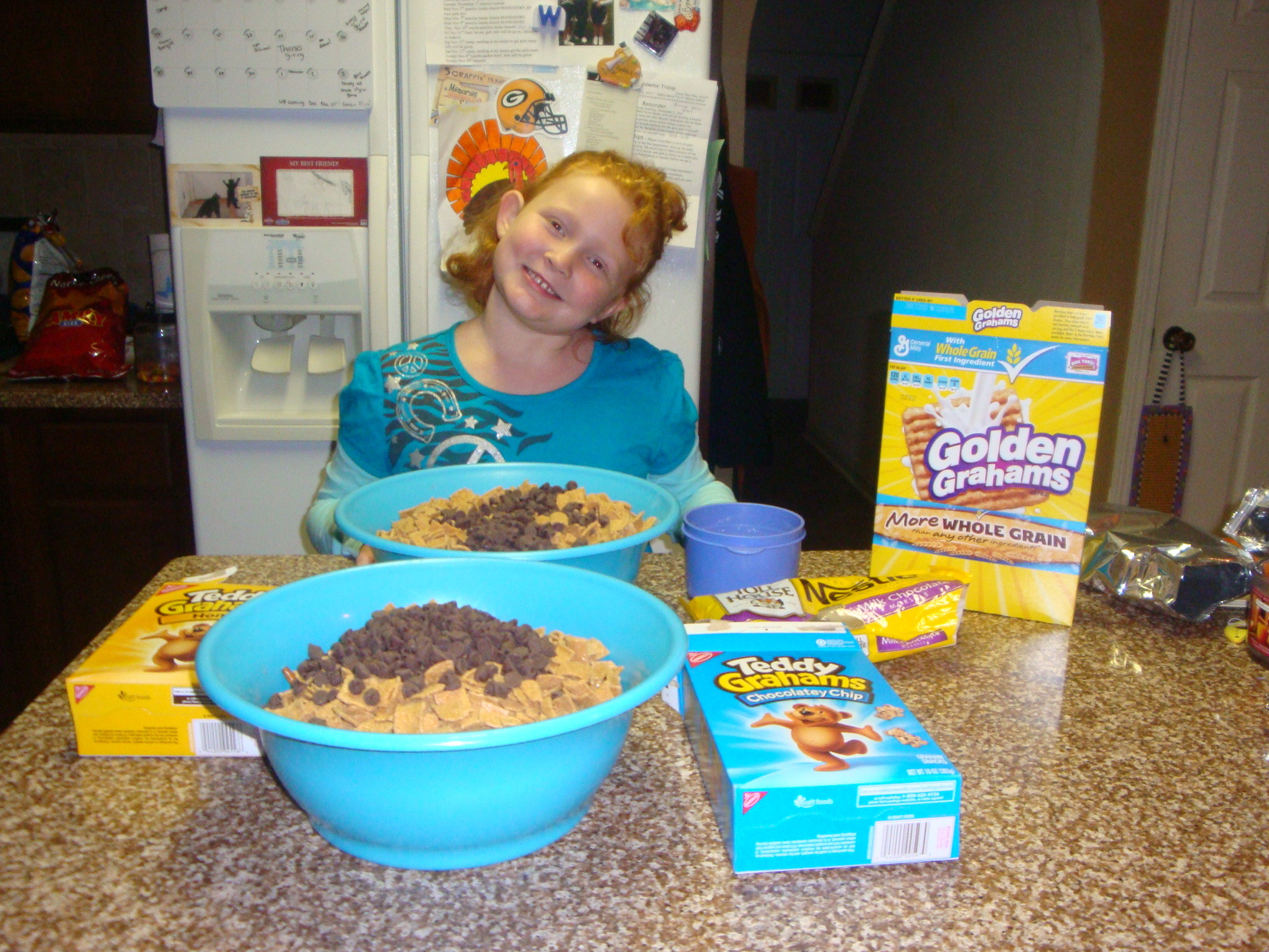 Pyper: Phoebe: Golden Grahams Golden Grahams Teddy Grahams 2 kinds Teddy Grahams Chocolate Chips Mini Chocolate Chips Pretzels Potato Sticks and then Phoebe had to out do her sisters mix and added the Mini Marshmallows~!