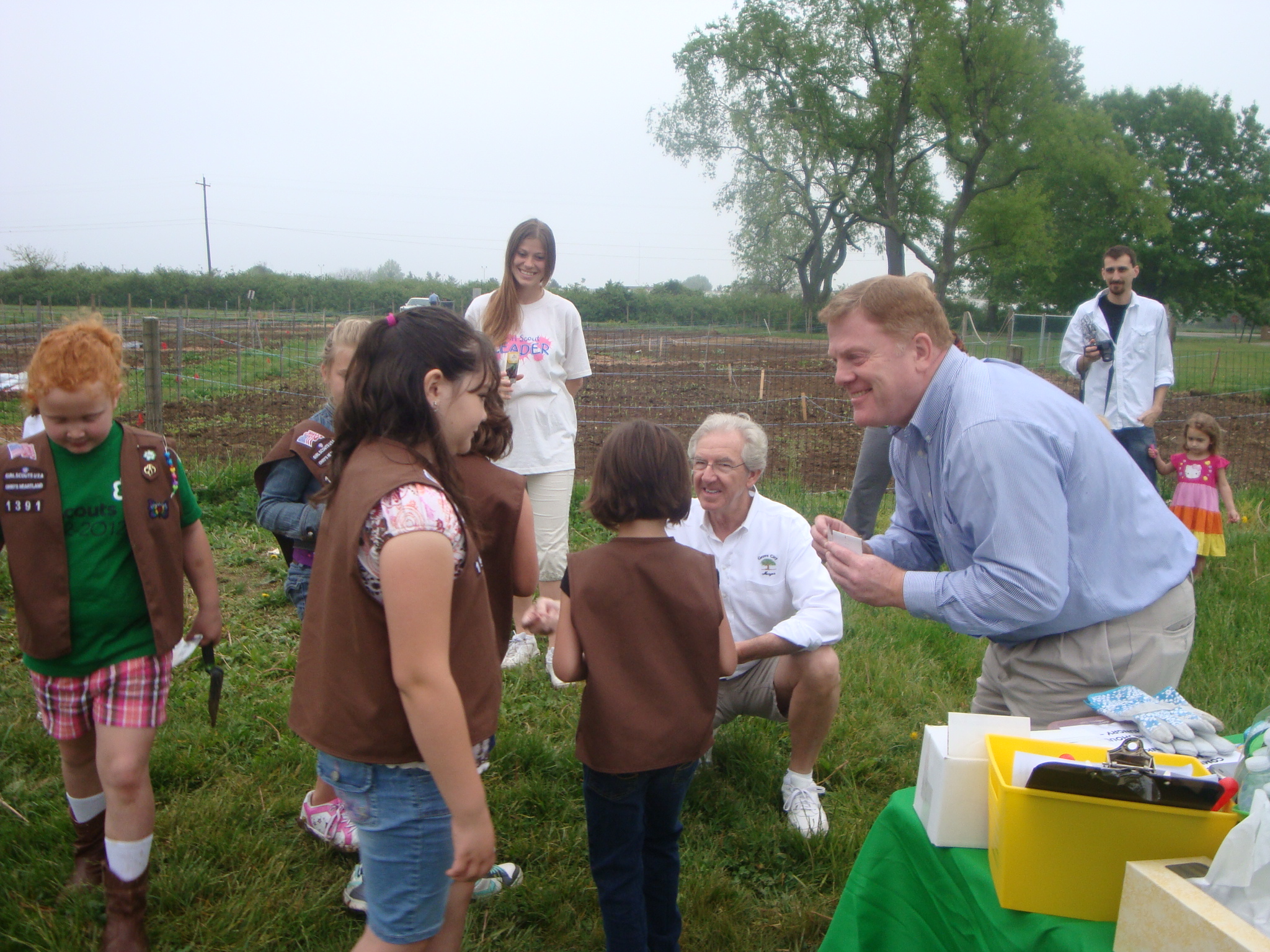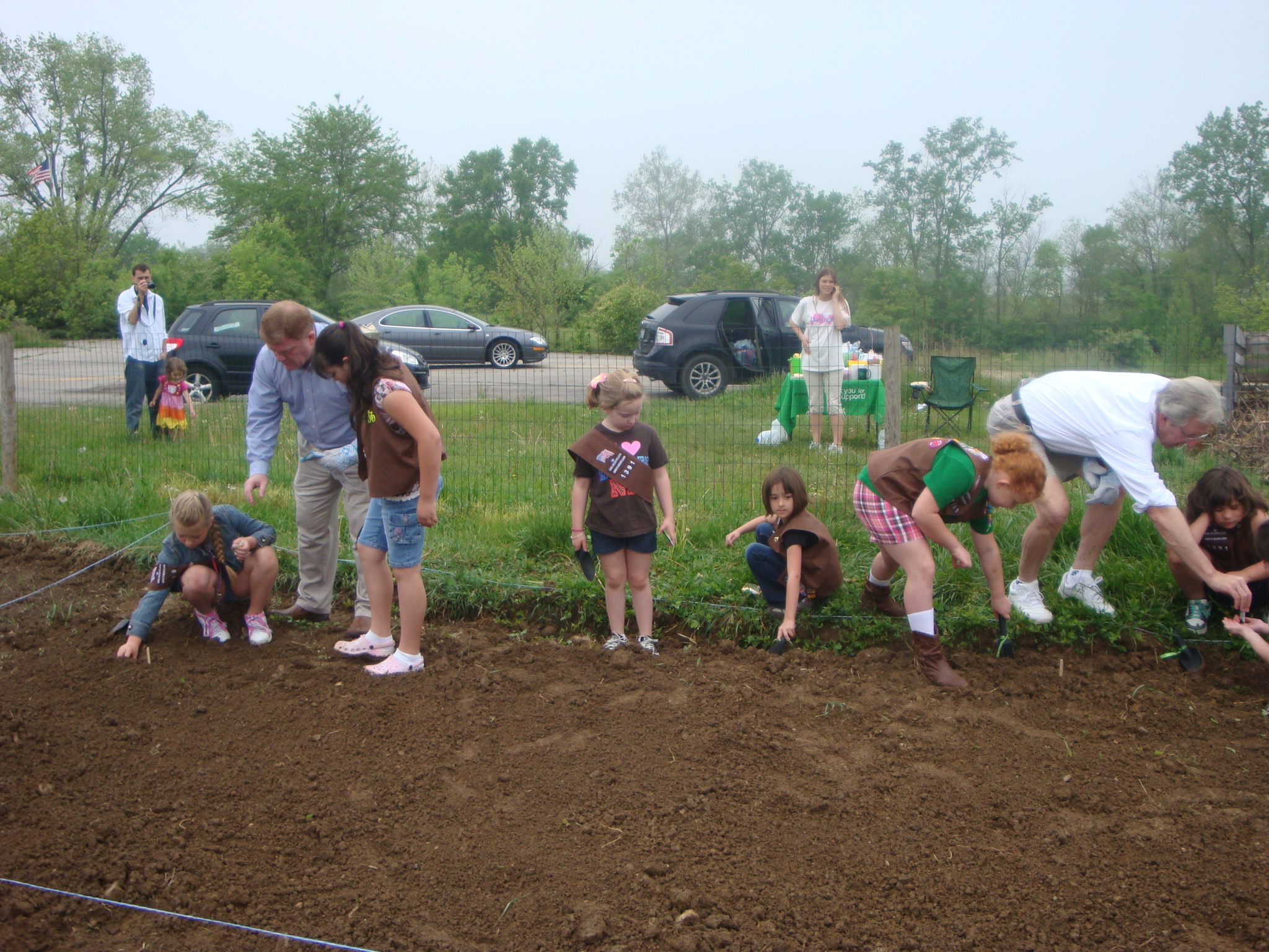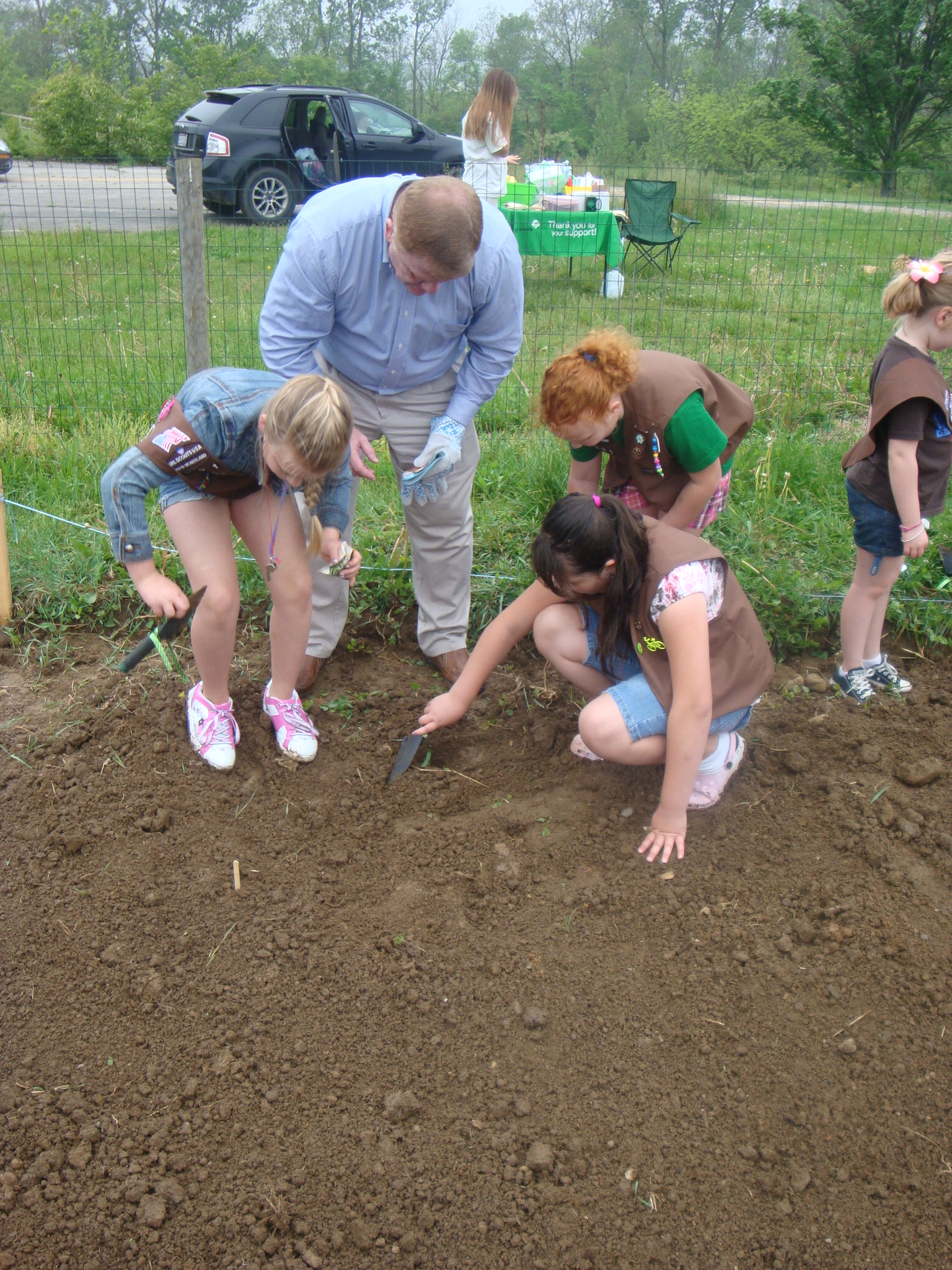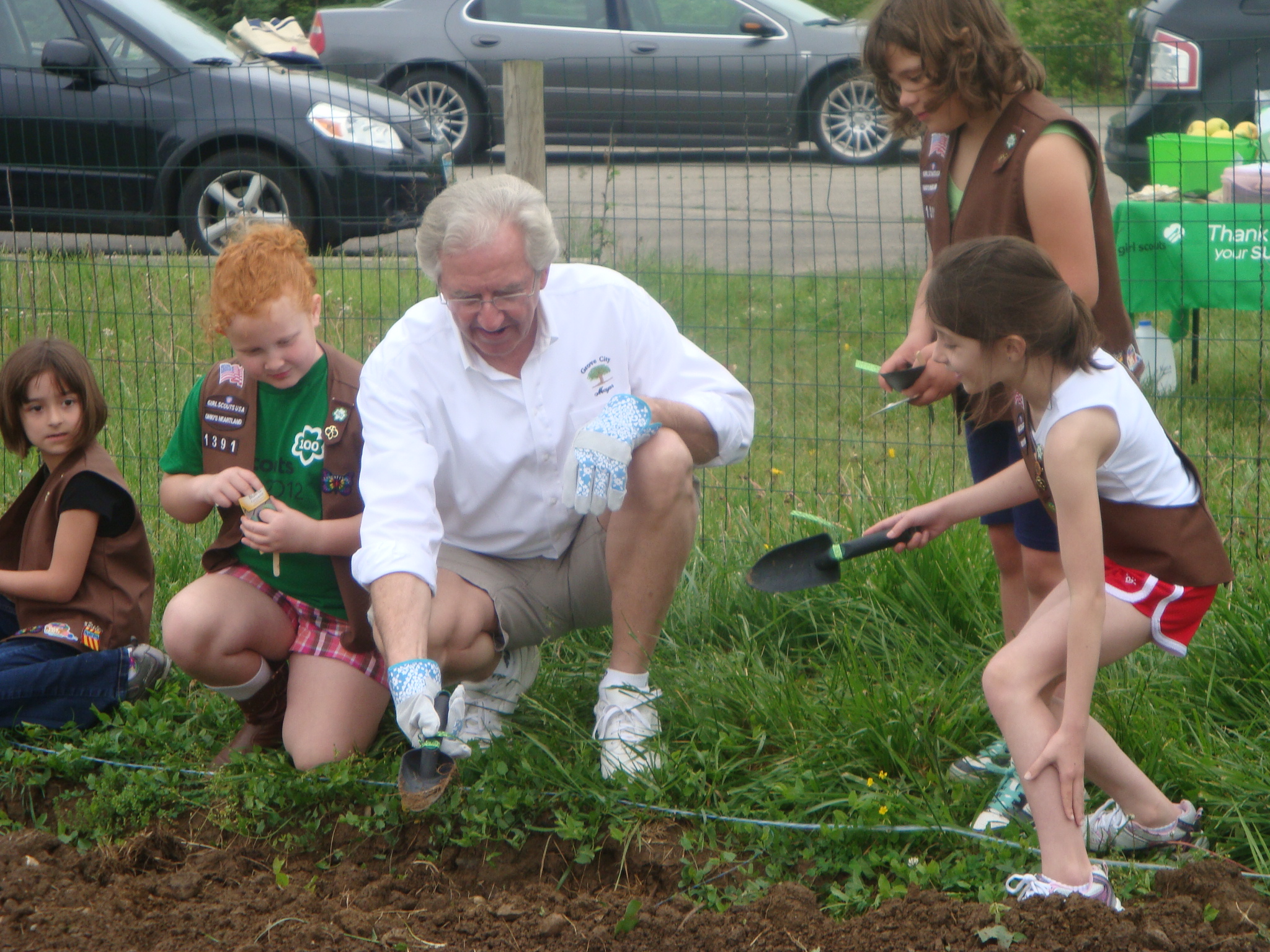 Saturday May 5th our troop met with Franlin County Treasurer Ed Leonard and Grove ity Mayor Ike Stage to plant a Community Garden. We met early to divide up the seeds to plant. While we waited for all the girls the Mayor explained how to plant the seeds.