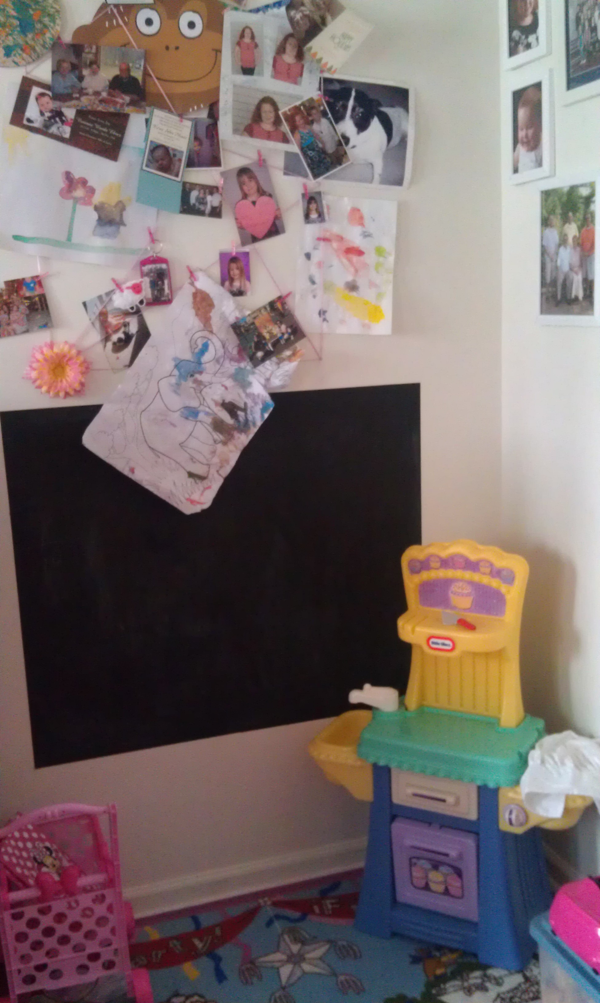 Nothing could be redone without cleaning out the playroom first. All the toys went up to the girls bedroom they are old enough now to play up there or carry down what they want to play with and take it back when they are done. I would leave some toys but not all of them and some went to charity no kid needs that many toys! I also had my husband take the old computer out that was an energy waster because it just sat there plugged in rarely used to watch Netflix. Cleaning this room took FOREVER the last thing I did was remove the pink shag rug the girls had to have….good bye pink!