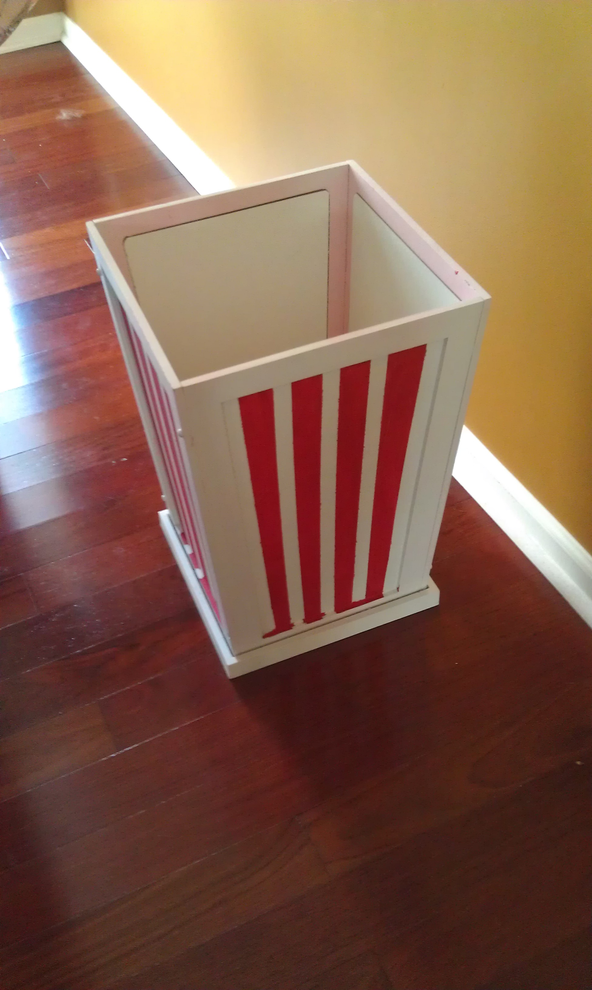 I printed out a popcorn sign on sticker paper and modge podged popcorn scrapbooking paper to the lid. I loved it and the girls did too, they put all their barbies in it, one of the toys I let them keep in that room~
