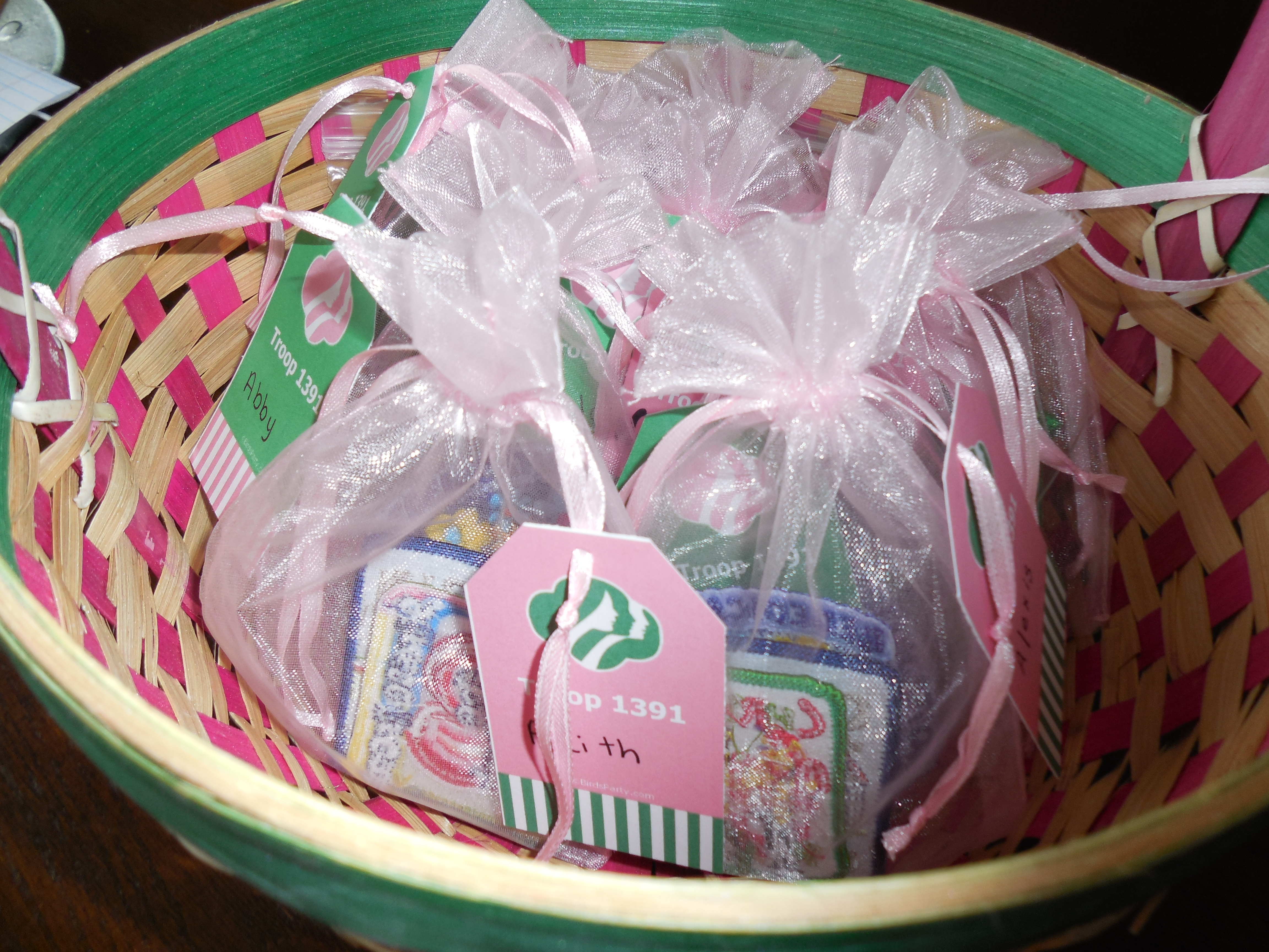 We put their patches that they had earned in little organza bags and used tags from Bird too!  We placed them in my girls Easter baskets that just happened to match!