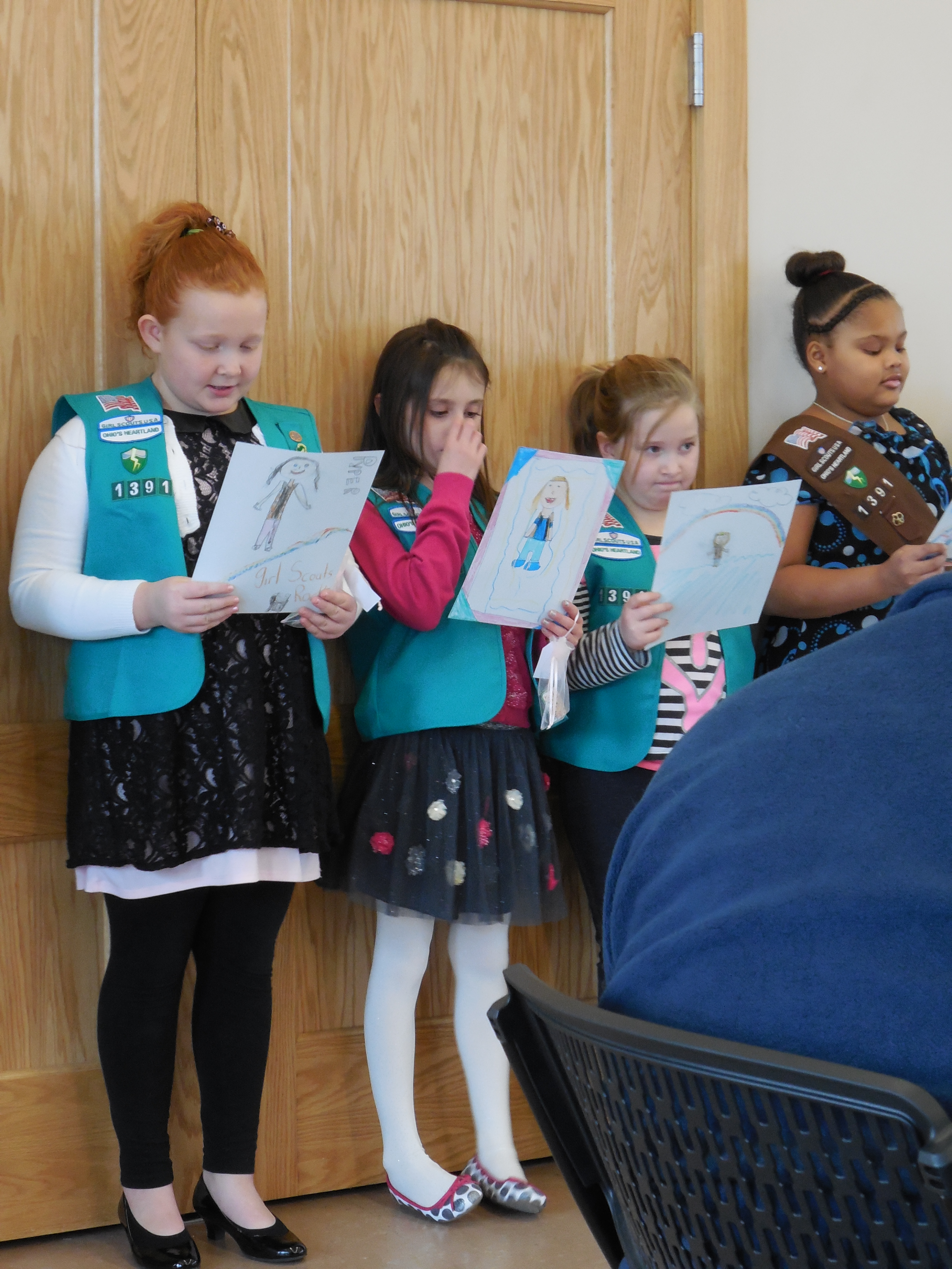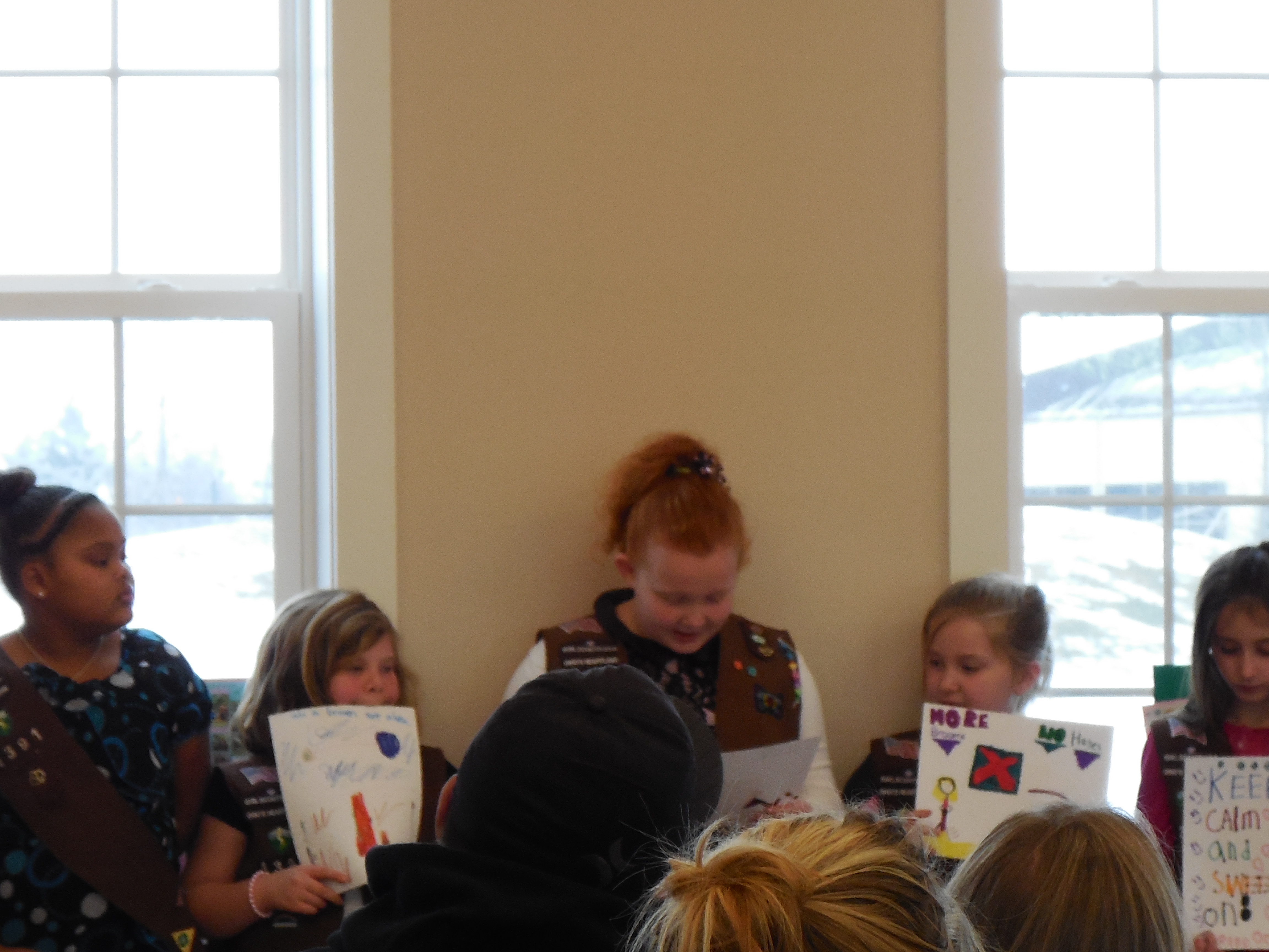 When I scripted the program I really wanted to showcase each of the levels and what they had accomplished so far. So for the Junior’s and their Road to the Bronze I had them read an excerpt from their Anti-Bullying Campaign speech. ( I will blog more about that soon!)  Our Brownie’s would showcase their  WOW Journey by telling their families how they have saved on water and showed pictures of how they would save water.  I would introduce the Juniors having worked with them on this journey and Ms. Erin would introduce the Brownies as she worked with them. Our new Daisies were super good waiting (-: