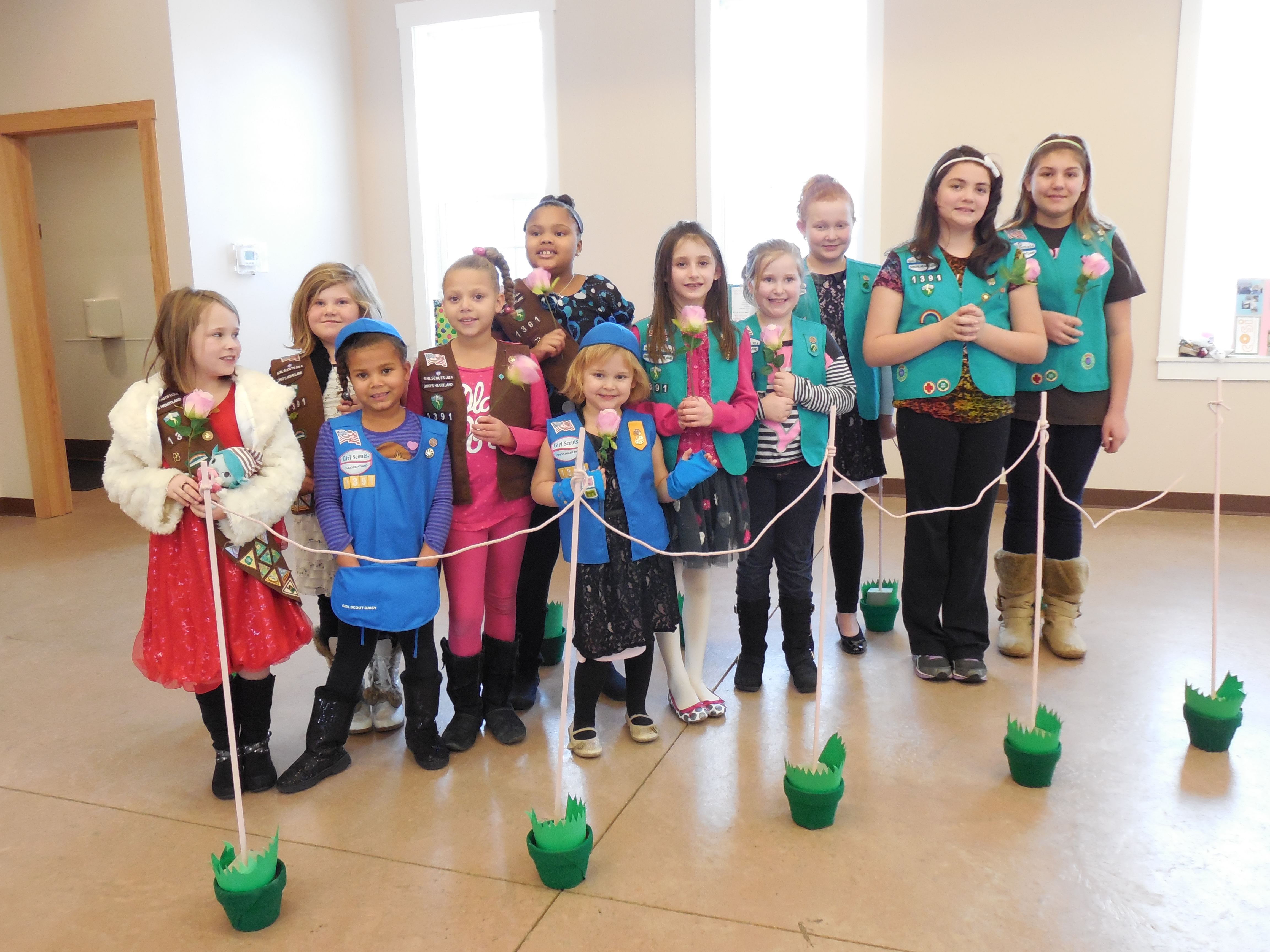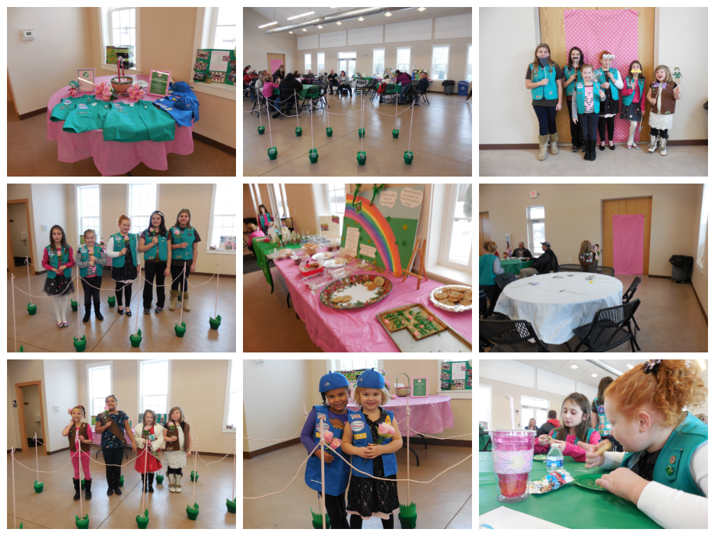 We used all green, pink and white table clothes to match then I used Bird’s creations to make photo blocks (from Oriental Trading Co) I used her print out for two sides, used the same pink, green and white card stock and printed out our girls names and the occasion for the other two sides, added ribbon and that is what was used as center pieces.  I had taken pictures when the weather was nice and we were meeting at the park, (our Daisies got their own since they were not in the troop yet) so we added those and that was the take home gift.