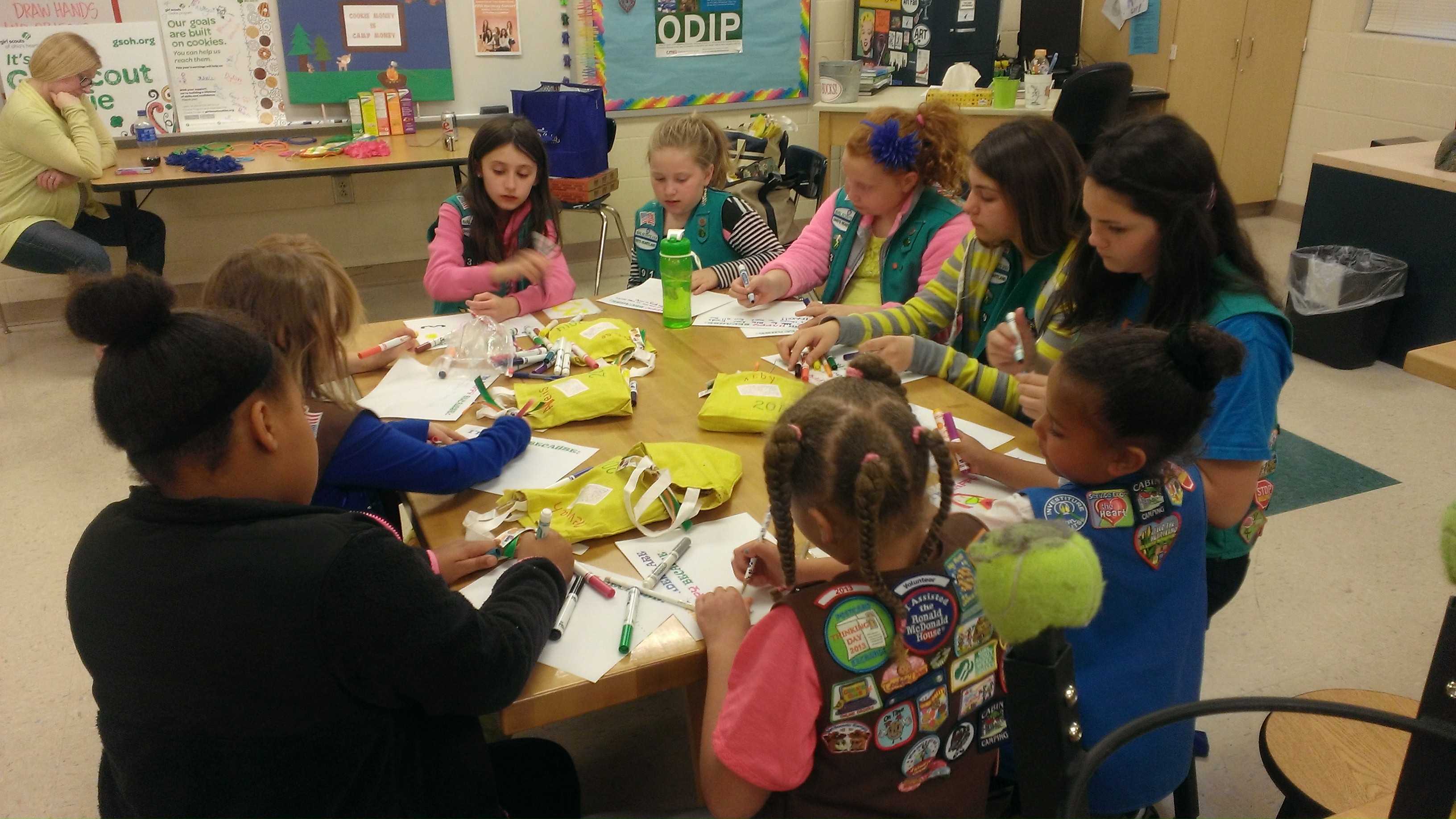 I also made small bags for each Scout used fabric markers to put their name on them and ironed on a wordle mix with all the girls names. Since we had camp coming up as a reminder I made s’more baggies with the details of our trip and sealed with an owl that I found at Micheal’s. Added their badges and more candy and was ready to give to the girls !